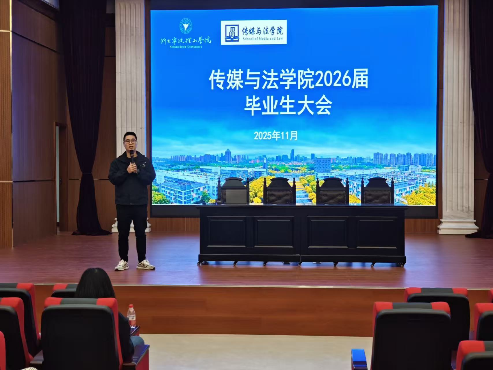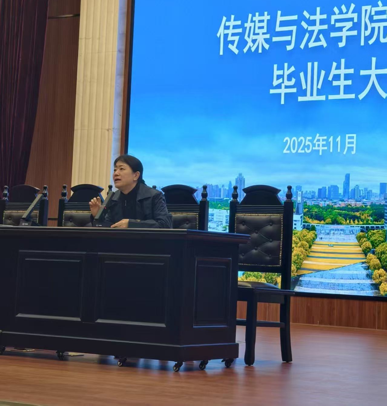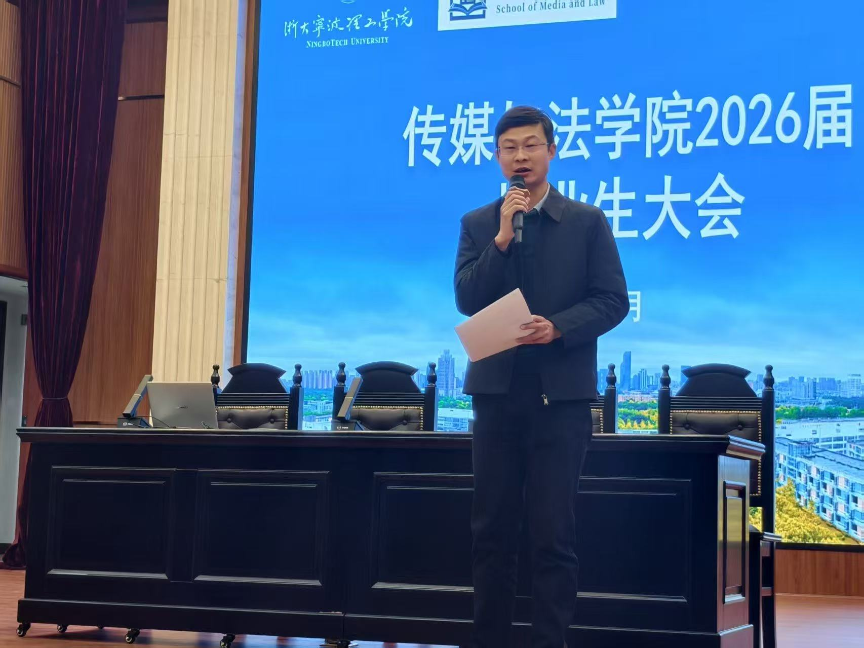 2025年11月19日,传媒与法学院2026届毕业生大会暨就业动员会在模拟法庭顺利举行。学院领导、系所负责人、教务办、学工办相关老师和全体毕业生出席会议。