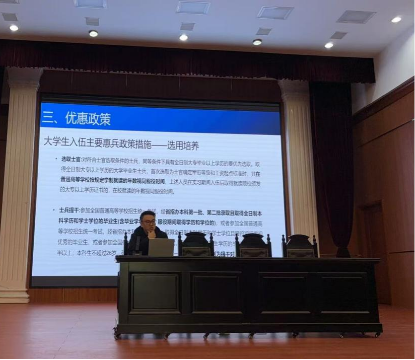 校团委刘笑成老师进行了毕业生征兵入伍和西部计划政策宣讲。他向同学们系统介绍了征兵入伍和西部计划的政策优惠、发展前景以及对个人成长的重要意义,详细解读了大学生应征入伍的基本条件、流程及优待政策,以及西部计划的实施方案和保障机制,为同学们提供了多元化的发展路径选择。