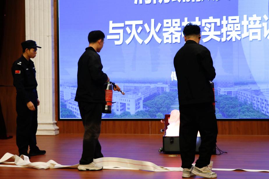 随后,安全保卫部燕永波结合真实火灾案例,系统阐述了掌握消防知识的重要性和紧迫性,并现场演示了灭火器与消防水枪的正确使用方法,针对日常使用中常见的操作误区进行了重点讲解与纠正。本次实训特别采用了新型消防安全电子灭火器进行模拟演练。器材的现代化设计与互动功能,显著增强了同学们的参与兴趣,使技能教学更加直观生动。