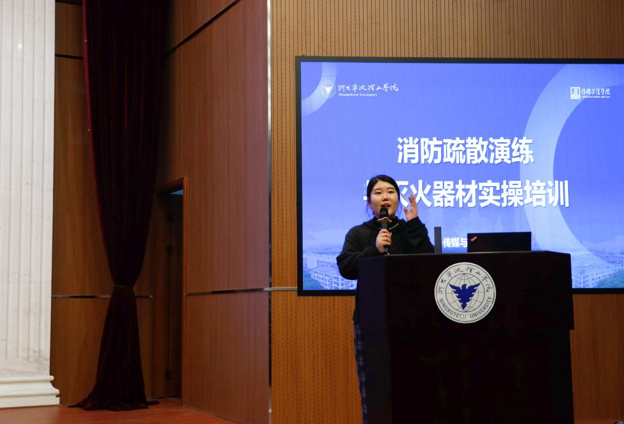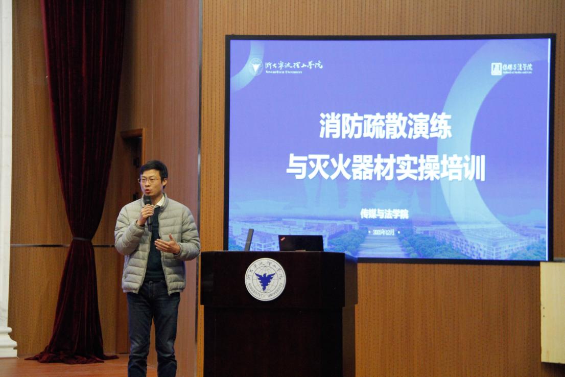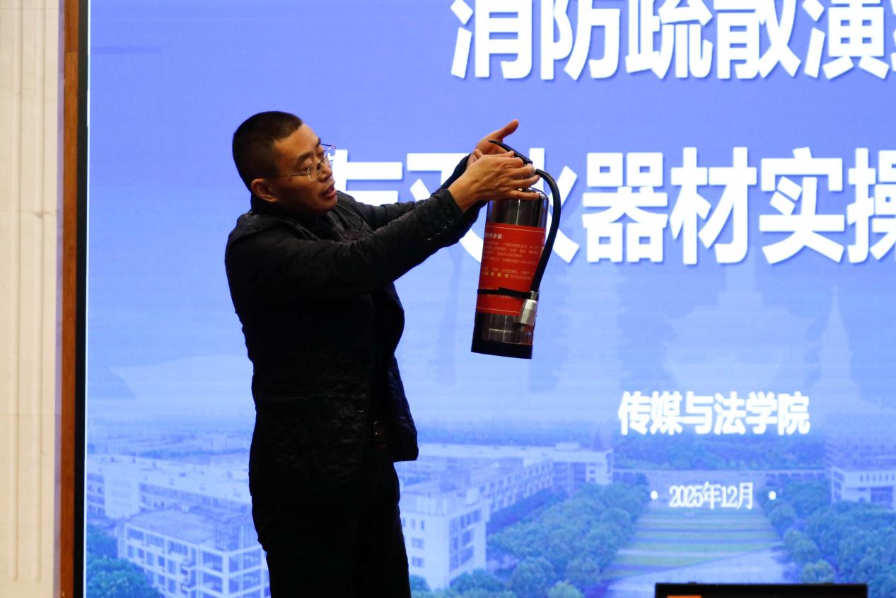 为切实增强师生消防安全意识与风险防范能力,全面提升应对突发事件的自救互救与应急疏散能力,12月3日下午,传媒与法学院组织开展了消防演练及灭火器材实操培训。学院党政办公室、学生工作办公室、实验室教师代表及百余名学生共同参与。活动邀请学校安全保卫部燕永波老师及相关安保人员进行现场讲解与示范。