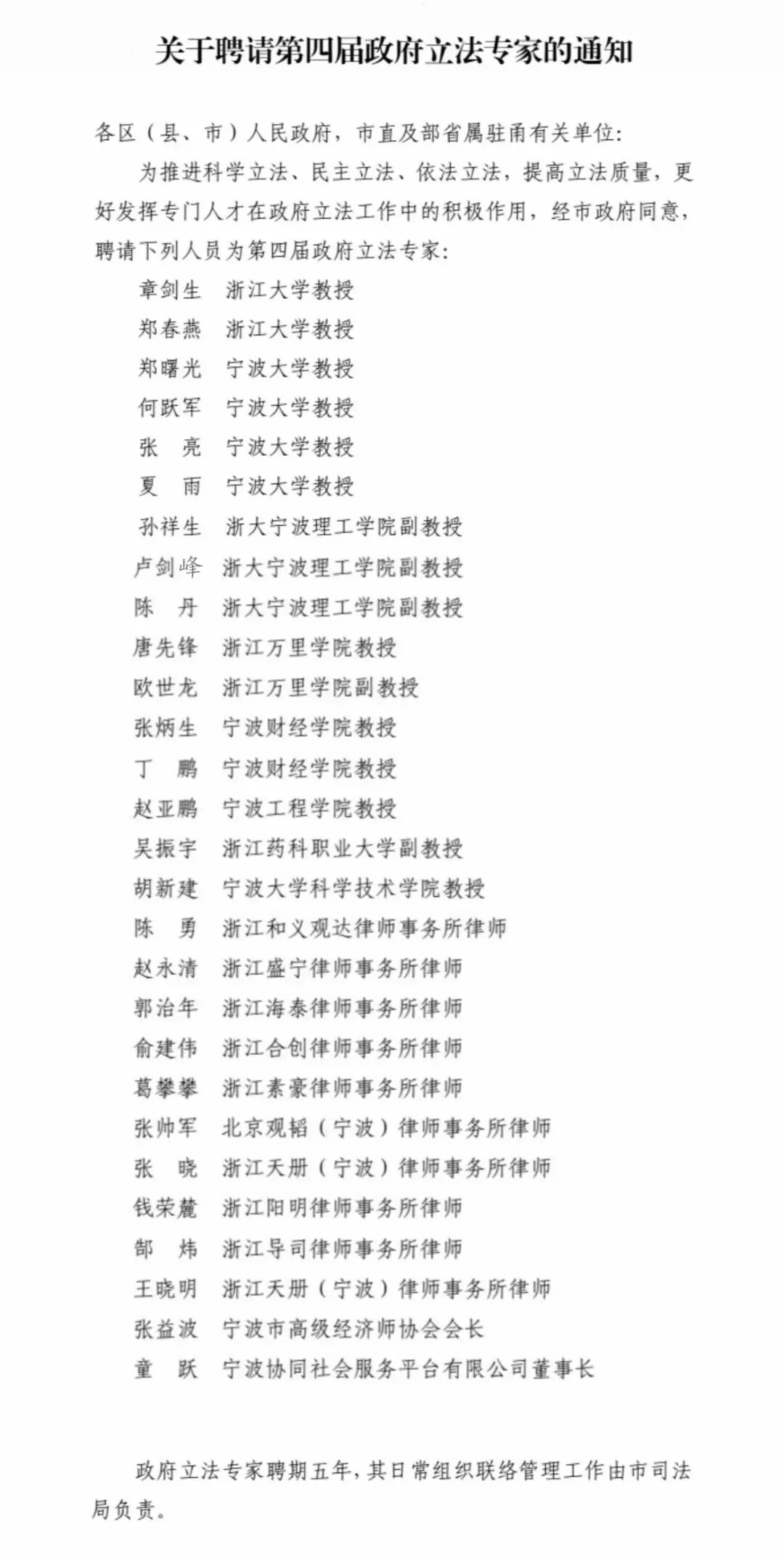 近日,经宁波市人民政府同意,宁波市司法局公布了第四届政府立法专家库名单,28名兼具深厚理论功底与丰富实践经验的专家受聘入库,为宁波市政府立法工作搭建起多元跨界的智力支撑平台。我院孙祥生、卢剑峰、陈丹三位教师受聘为专家库成员。受聘专家将围绕宁波经济社会发展重点和改革攻坚实际需求,深度参与地方性法规案、政府规章的起草、论证、评估等全流程立法工作,以专业力量赋能科学立法、民主立法、依法立法,为宁波法治建设提质增效贡献智慧与力量。