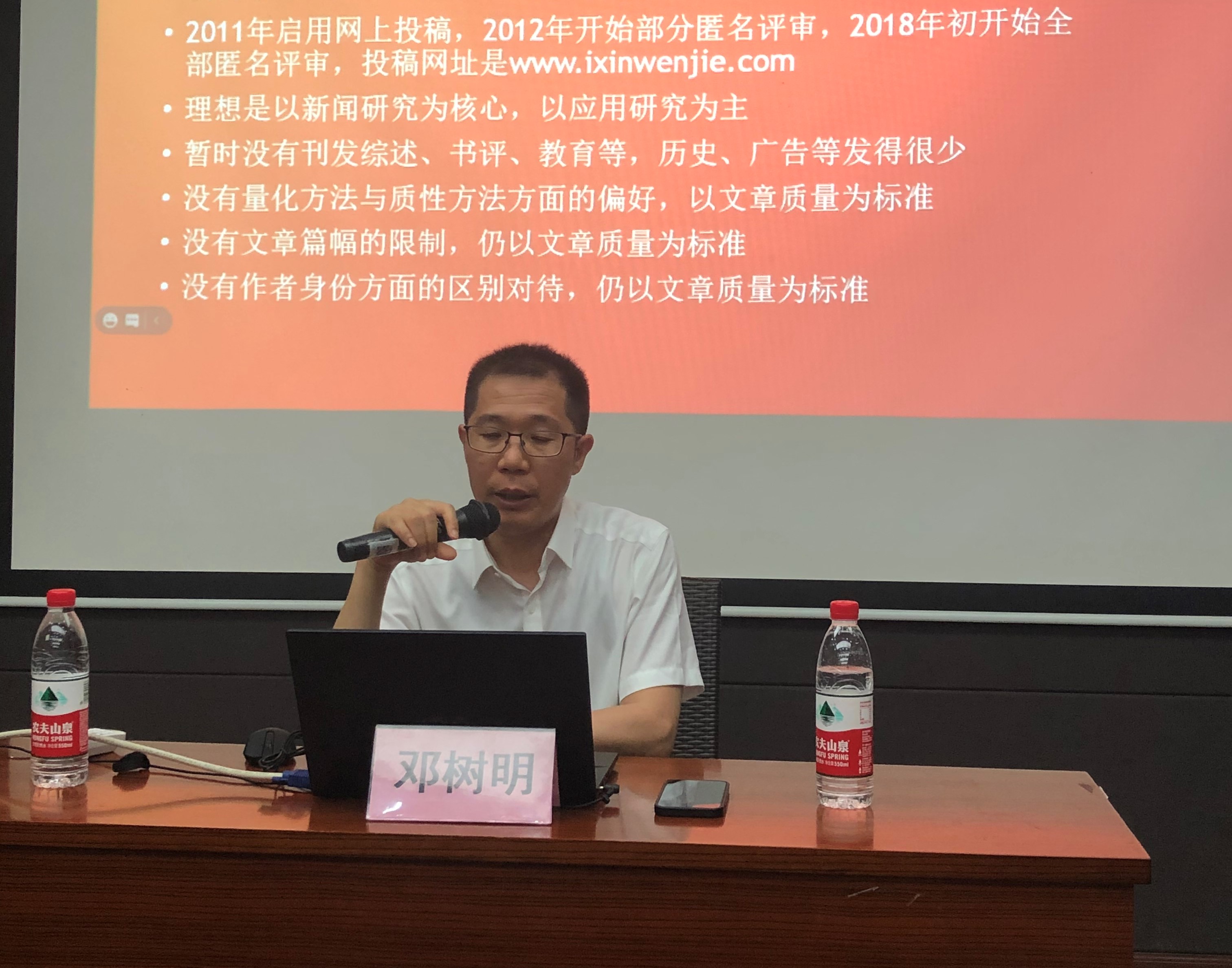邓树明总编辑认为,新闻传播研究方法是一种社会科学的研究方法,是将一般意义上的议论文变成学术性成果的重要手段。新闻传播研究方法既包括搜集资料的方法,也包括分析资料的方法;既包括量化和质化的研究方法,也包括思辨性研究。这些方法分别对应着实证主义范式、阐释学范式、逻辑思维范式。他特别强调,文献法不是文献梳理,也不是文献综述,而是把文献作为研究对象和材料来源的一种研究方法。他以《新闻界》近年来的投稿文章作案例,总结梳理了论文标题、摘要、引言、文献梳理、研究方法等五个方面可能出现的问题,并提出了意见和建议。针对新闻传播学科教师关心的学术论文写作和发表问题,邓树明总编辑介绍了我国新闻传播核心期刊发展情况和《新闻界》的定位及对稿件的要求,从问题意识、方法意识、现实观照等方面对论文写作阐述了自己的见解。