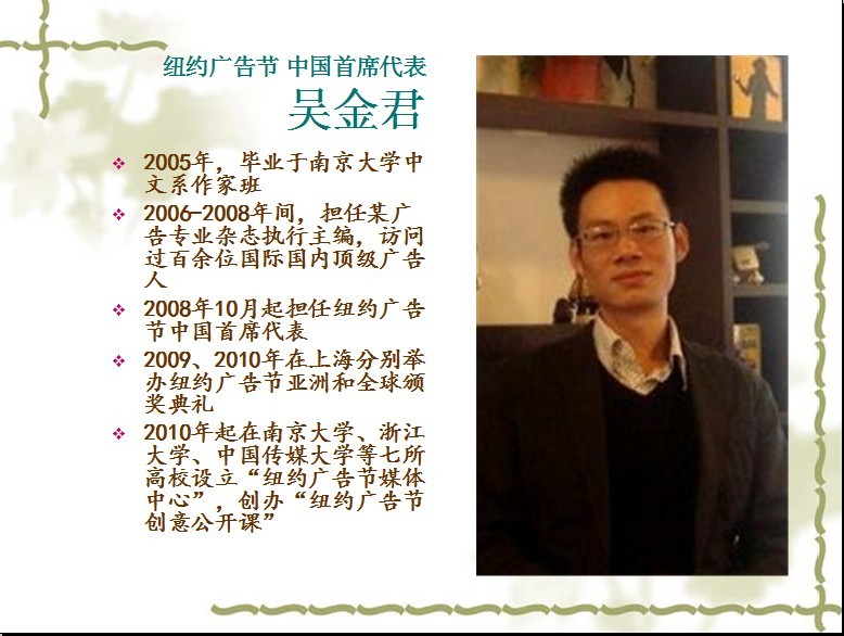 2005年,毕业于南京大学中文系作家班,2006-2008年间,担任过一本广告专业杂志执行主编、一档广告人物电视访谈栏目制片人,访问过百余位国际国内顶级广告人。2008年10月起担任纽约广告节中国首席代表,2009、2010年在上海分别举办纽约广告节亚洲和全球颁奖典礼,2010年起在南京大学、浙江大学、中国传媒大学等七所高校设立“纽约广告节媒体中心”,创办“纽约广告节创意公开课”。