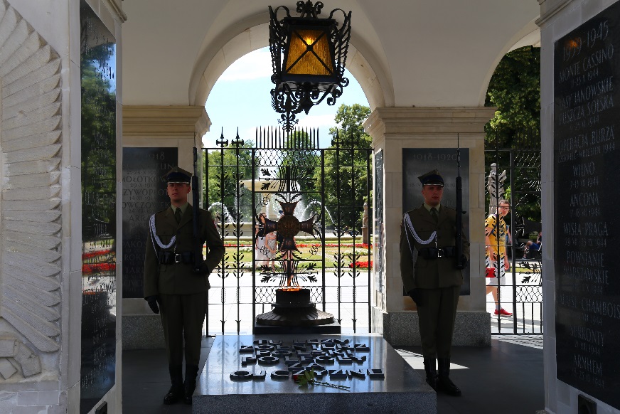 通向华沙老城的道路经过毕苏茨基广场,不灭的圣火绽放于无名烈士墓,火上盖有白色小亭,亭内有两名士兵守护。烈士墓背后是老萨克森王宫的花园,只是王宫的建筑早已在二战中灰飞烟灭,盛景不在。